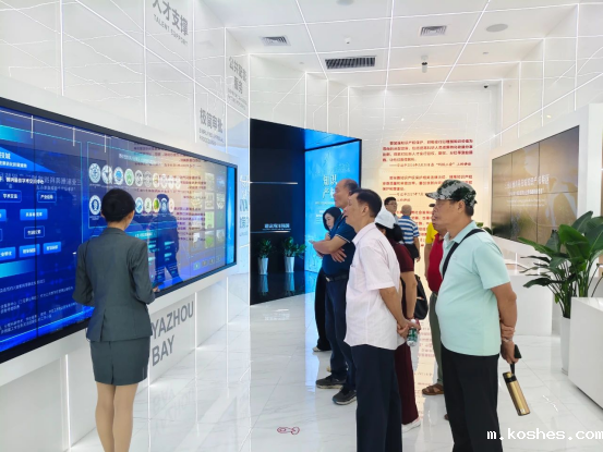 在崖州湾科技城产业促进中心,讲解员通过播放宣传片、展示沙盘和模型等多种方式,详细介绍了崖州湾科技城的总体规划、核心理念、发展目标以及重点产业布局。老干部们认真聆听,深入了解崖州湾科技城的宏伟蓝图和先进科技应用,沉浸式感受科技的独特魅力。
